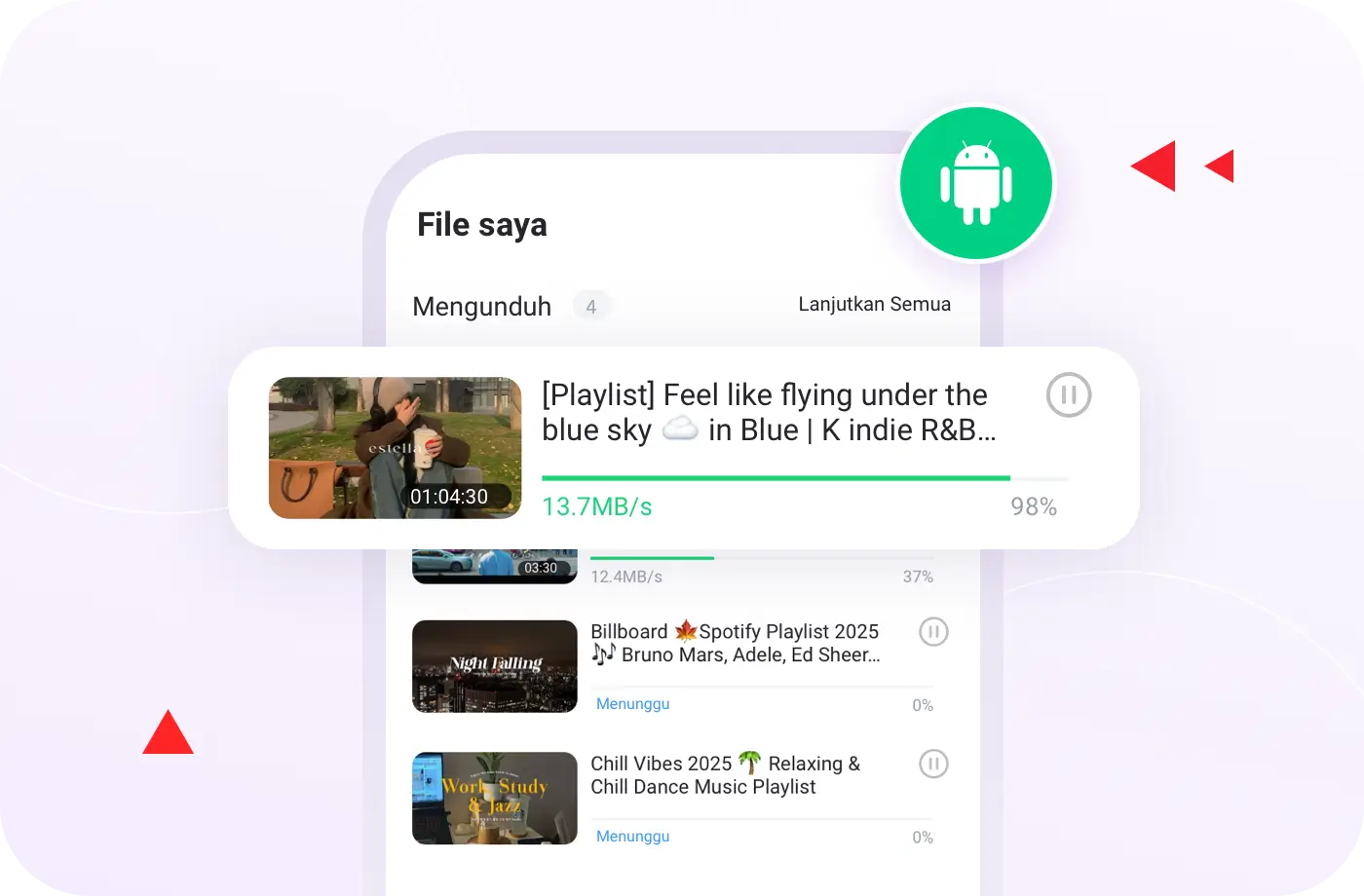 Jika koneksi terputus atau Anda meninggalkan Wi‑Fi, Anda dapat menjeda unduhan dan melanjutkannya nanti dengan satu klik.